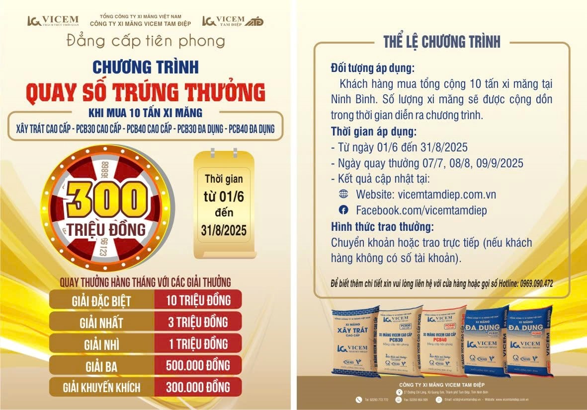 Nhằm tri ân khách hàng, đối tác và cán bộ công nhân viên đã đồng hành, ủng hộ Công ty Xi măng Vicem Tam Điệp trong suốt thời gian qua, ngày 08/8/2025, Công ty Xi măng Vicem Tam Điệp đã tổ chức thành công Chương trình Quay số trúng thưởng đặc biệt – Tháng 7 với sự chứng kiến của Ban lãnh đạo Công ty, đại diện Xí nghiệp tiêu thụ cùng các phòng ban và khách hàng thân thiết.