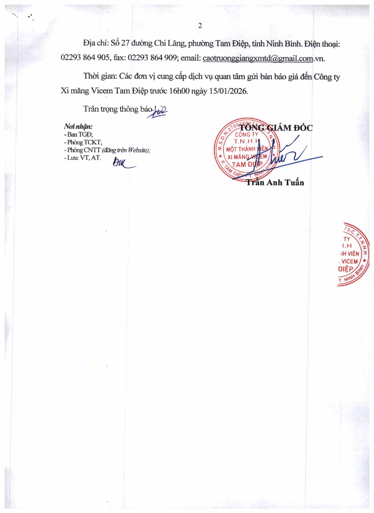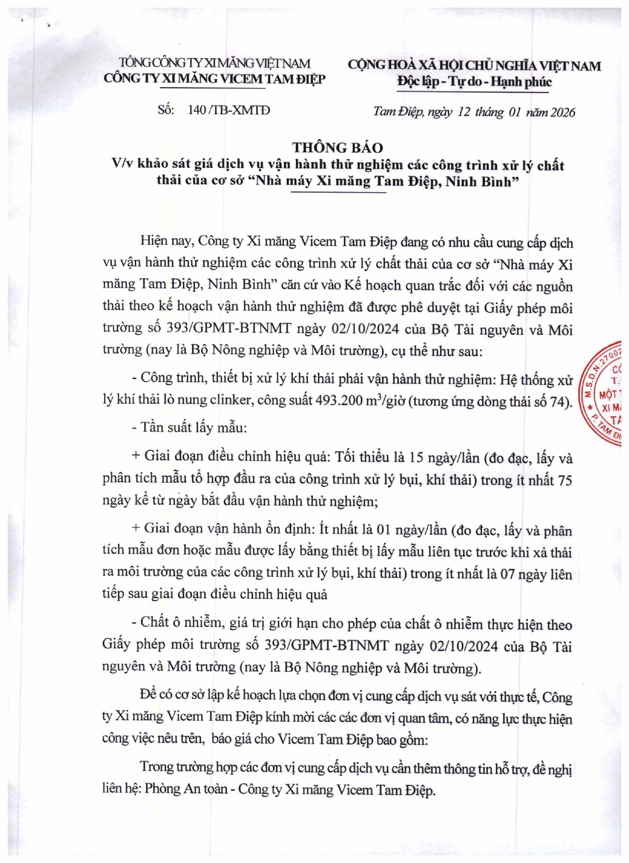 file đính kèm : Thông báo về việc khải sát giá dịch vụ vận hành thử nghiệm các công trình xử lý chất thải của cơ sở “Nhà máy Xi măng Tam Điệp, Ninh Bình”